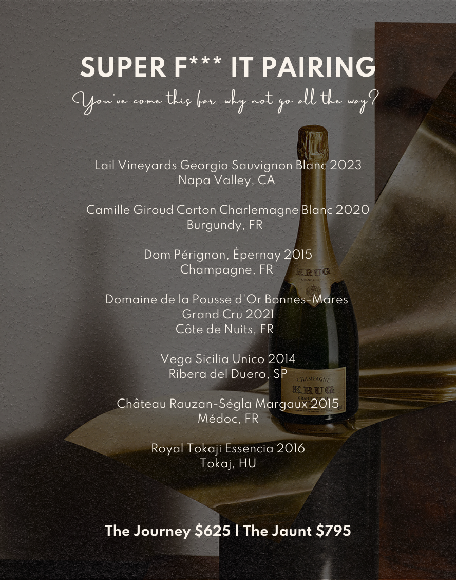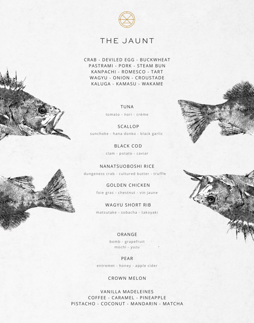 We spared no expense for those guests who elect to experience "The Jaunt!" The Jaunt tasting menu consists of over 20 preparations showcasing some of our favorite luxury ingredients, including caviar, madai, golden chicken, and crown melon!